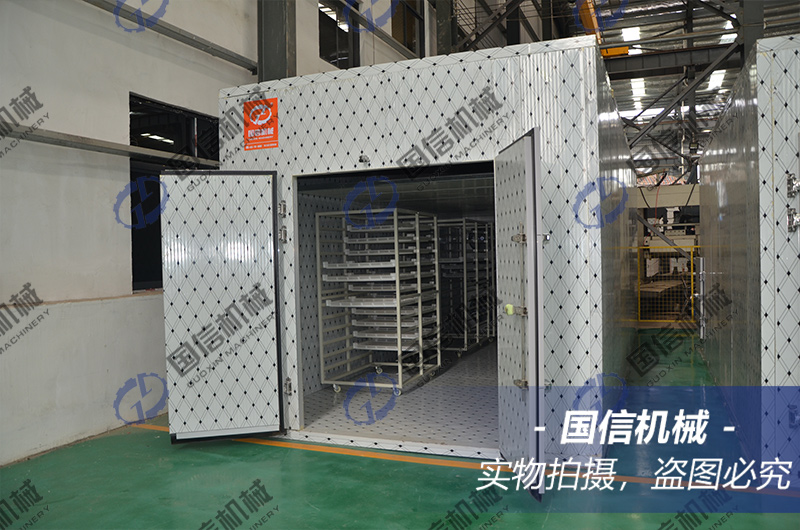 板鴨烘干工藝以及板鴨烘干機使用方法:將擦干之鴨體加以整型,將其掛入竹杠上,放入空氣能板鴨烘干房。以空氣能板鴨烘干機為例設置烘干參數,首先45~50℃熱風干燥約6小時后,移置于約15℃冷風處冷卻5~8小時,使鴨體定型,并可使皮膚出現乳白色,如用一次烘干時,則皮膚易變暗褐色,外觀不良。冷卻后之鴨只再以45~50℃熱風干燥。