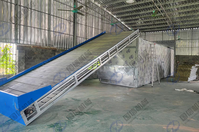 網帶式木瓜絲烘干機主要由烘干箱體、熱交換爐、輸送裝置、均料裝置、保溫裝置、熱風輸入裝置、電控溫控裝置等構成。與物料的接觸件為純不銹鋼材質,全套設備運行可靠,沒有易損件。經過處理后的木瓜絲由輸送帶送到頂部上層網帶上,木瓜絲隨網帶呈“S”形從上層往下層移動,熱氣流自下而上穿過網帶及其上的物料層,多層循環翻轉,逐層烘干,直至烘干完成,烘干后的木瓜絲從底層的出料口排出。在落料過程中,物料受熱面改變,保證干燥的均勻性。